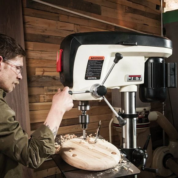 Wiertarka kolumnowa Jet JDP-15B została specjalnie zaprojektowana do obróbki drewna. Kluczowymi cechami wiertarki są 80 mm posuw z jednym obróceniem rękojeści oraz zintegrowany ogranicznik głębokości służący do powtórnego precyzyjnego wiercenia. Efektywne napędowe pasy klinowe zapewniają płynną pracę bez oznak wibracji z maksymalnym przeniesieniem mocy silnika na wał. Szybki system napinania taśmy umożliwia prostą i łatwą zmianę prędkości bez konieczności wykorzystania narzędzi. Górna ochronna osłona taśm wyposażona została w wyłącznik bezpieczeństwa i przytrzymywana jest za pomocą magnesów. Stół oferuje bardzo dużą powierzchnię roboczą. Jest on wykonany z obrabianego żeliwa i wyposażony został w dwa rowki T oraz centralną wkładkę z regulowaną wysokością. Precyzyjny stół można łatwo odchylić z dwóch stron o 45 ° oraz wyregulować tak, aby była zagwarantowana prostopadłość środkowej osi uchwytu zaciskowego. Wysokość stołu można regulować płynnym układem za pomocą koła zębatego , przy czym dźwignia sterująca jest oddzielona od stołu. Wydajny silnik indukcyjny jest mocno przymocowany do konstrukcji, dzięki czemu całkowicie wyeliminowane zostaje ryzyko wygięcia oraz powstawania wibracji. LED oświetlenie robocze osadzone jest w odlewanym wrzecienniku, a w celu łatwiejszego wiercenia dostępny jest również laserowy krzyż. Kompleksowy system ogranicznika głębokości umożliwia dokładne i precyzyjne wiercenie otworów nieprzelotowych. Maszyna została zaprojektowana w taki sposób, aby sprostała wszystkim wymaganiom związanych z pracą dotyczącą obróbki drewna.Maszyna oferuje wystarczająco dużą powierzchnię roboczą, masywną konstrukcję oraz zapewnia maksymalną głębokość wiercenia. Płynna praca wrzeciona oraz mnóstwo unikalnych funkcji przesuwają wiertarkę kolumnową na pierwsze miejsce.